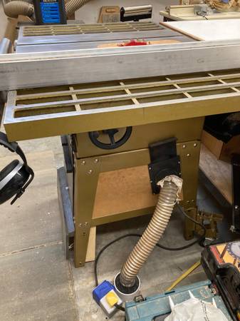 Nicely working 10” table saw operating on either 110v or 220v single phase 1 1/2 HP motor. Cast iron table (40” x 27”) with precision Vega fence. Boxed in base for better dust collection and a handy magnetic kick off switch for safety. Included is a crosscut jig, tendon jig and picture frame making jig. 30” rip capability. Cast iron trunnion completely cleaned and lubricated (graphite) in June. Two caster wheels on front for limited mobility. T track miter gauge included. May consider delivery options.