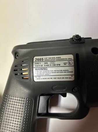 3/8 inch Super Cyclone Industrial Heavy Duty black and decker drill. Has drill, chuck, charger and battery (battery will not hold charge.) Use as spare parts or get a new battery and have this...