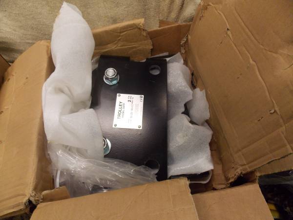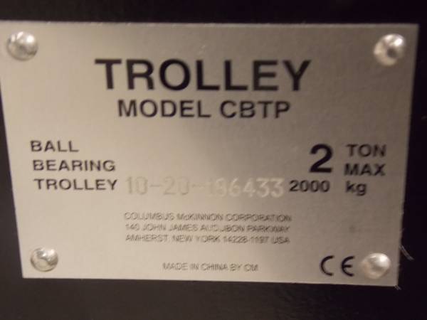 Top Quality Name Brand (CM) New fully adjustable width from 4-1/4" wide I Beam to 9" wide. Capacity 2 tons or 4000 Lbs We have 2 of these if you want both. The 3" diameter solid wheels can handle a flat bottom I-Beam ,or a tapered style. The best price we could find on this CBTP0200 model is $328.00+Tax + Shipping= $400.00 ..If you are building some kind of a Jib Crane Gantry Crane or Bridge Crane .Let's talk we have 2 Jib Cranes on site for you to look at for ideas on what you might want to build. Call and we can help you hopefully (952)854-5 seven eight six