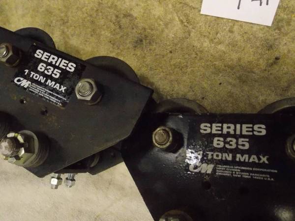 The first picture is just to show how this look when mounted to a hoist, the following pictures are of the one for sale.I have one just like this I used for years and I lift 1200 Lbs. all the time with it, so the 500 Lb. capacity on it is for OSHA reasons generally)(there's a picture showing the frame a very thick .312" ) (The last 2 pictures are of a 1 ton trolley I also have for sale, check out my ebay store) This CM Lodestar Trolley was designed to be utilized with the CM Hoists where versatility and strength are key components. Add a low headroom trolley to your Lug mounted Hoist and gain some headroom. This can easily be adapted to work with many Hoist Brands.It can be adjusted for I Beam Widths from 3" to 6" wide.