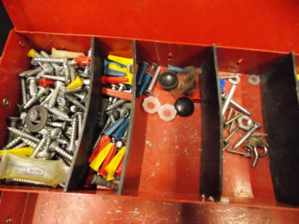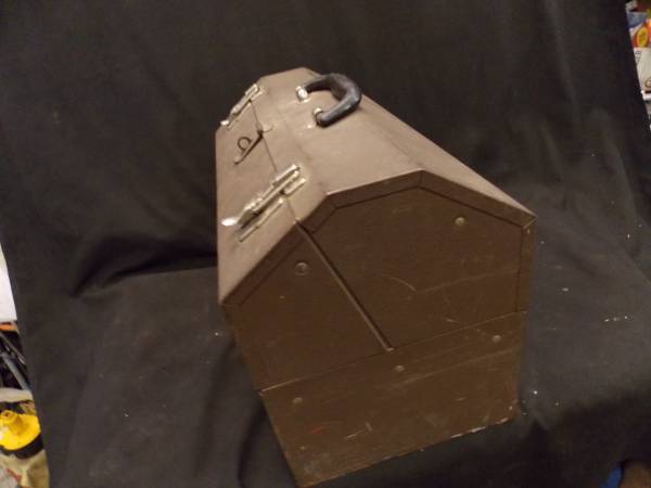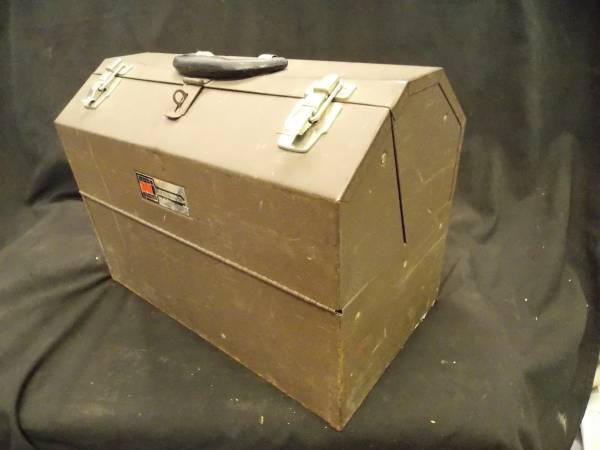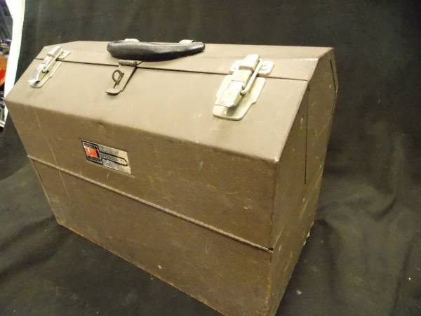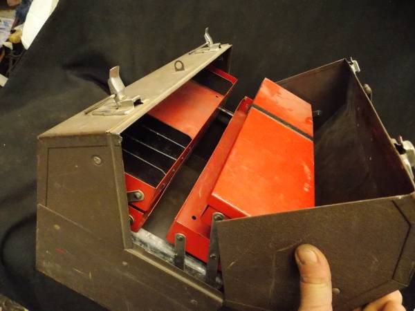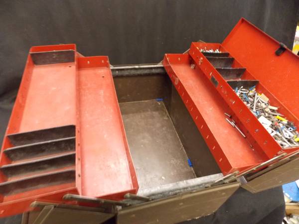 On Ebay a tool box Like this are selling for over $200.00 for the Empty Box alone. This measures 18" x 10" x 13" Tall. Vintage Collectable folding cantilever toolbox accordion Waterloo Industries Inc (Key to Quality ) tool box. Some call it a Steel Metal Tombstone or Hipped Hip Roof . It is in very good condition. Comes with over many compartments full of Screws and Wall Anchors, and other hardware. Call (952)854-5 seven eight six