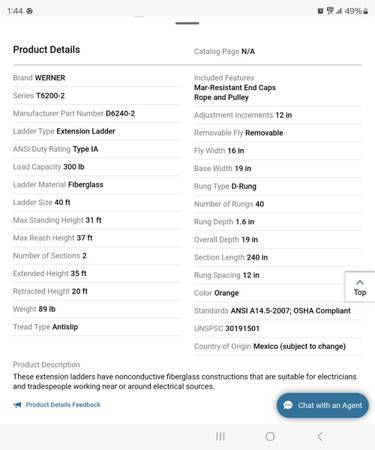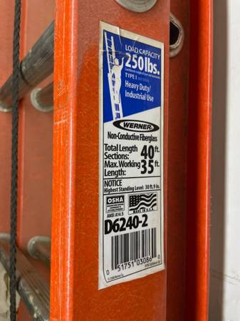 Werner 40ft orange250lb rated Ext ladder 35ft ext. when open 20ft closed used on one project like new must sell moving soon half price Asking $450 bo cash only located in Moundsview Cash CashApp...