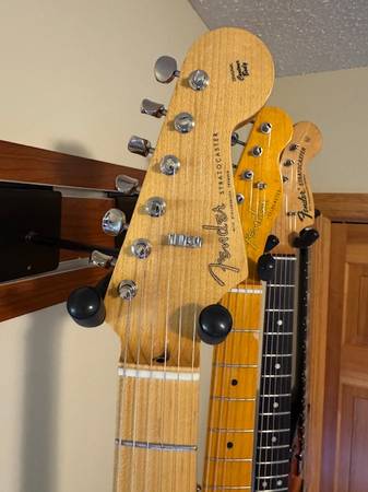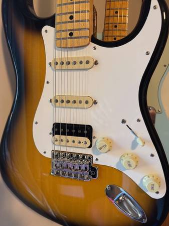 Fender JV 2024 Stratocaster with very nice Gig bag. In absolutely perfect as new condition with locking tuners from the factory. The neck has a soft V shape and is 15/16" thick all the way up the neck. Push pull on the bridge tone pot to split the humbucker for more tone choices. excellent tremolo that stays in tune. 6lbs-12oz.