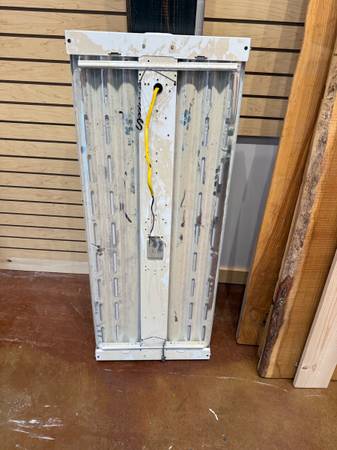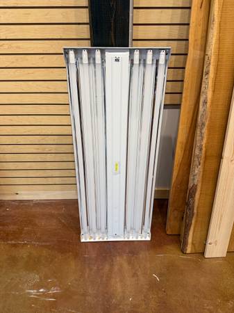4 shop lights. Each supports 6 bulbs. Used and dusty, but in fine working order. Bulbs not included. Price is for all 4 fixtures