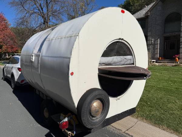 One-of-a-kind camper/icehouse built with a distinctive round, airplane fuselage-style design — turns heads everywhere it goes! This setup is perfect for ice fishing weekends or camping getaways year-round. 7.5’ circle body, 10ft long. Fully insulated. Call: Seven 63- 954-1777.