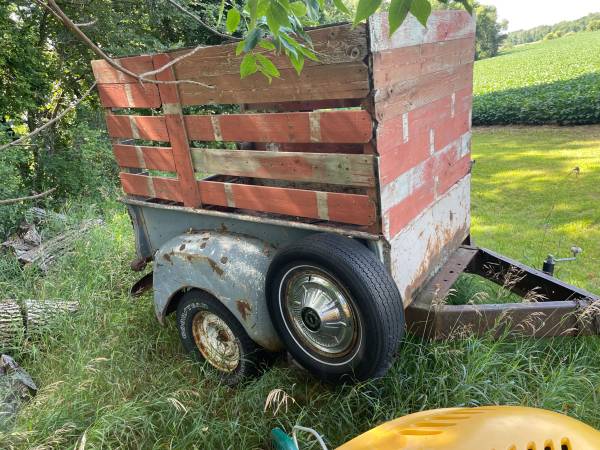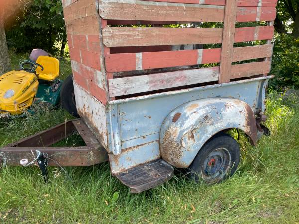 This old trailer works, could use new tires and lights repaired. It’s made from a vintage Studebaker step side truck box. Tailgate is there, which has some antique value by itself. It has what ‘I believe’ is the original truck rear end, which may also have some collector value by itself. No, it’s not pretty, but it is pretty cool.