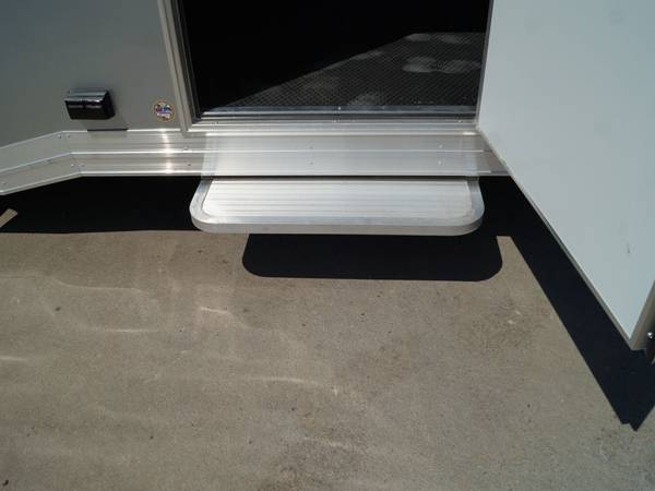 Exterior is screwless .040 aluminum with polished stainless trim and a one-piece roof. Rear ramp has a TPO surface and stainless latches.