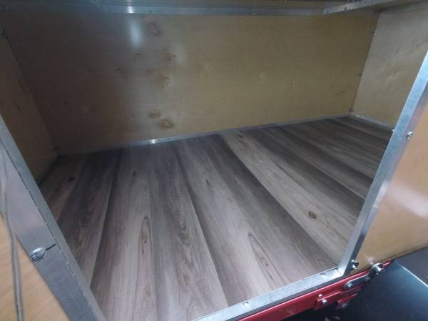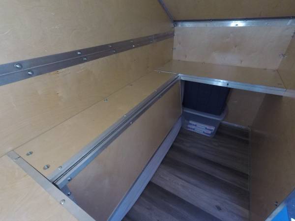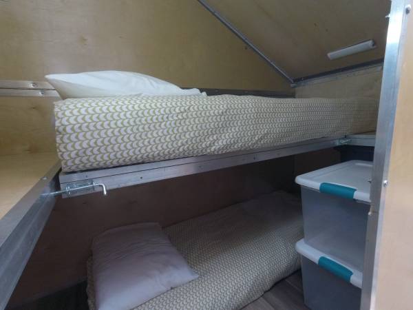 Here is a video tour of my camper https://youtu.be/TGBjoqGMTmg?si=plLyLdz6GaW9dYhT This is a home-built folding hardside camper that you can stand up inside. 6 foot entry door, 7 ft 10 inches interior height to the peak, 950 LB total weight so it easily tows behind my compact Mazda 3 sedan. Unfolds with one minute setup time. 4' x 8' floor area. 18" x 48" kitchen counter with sink. 24" x 48" desktop area. sleeping for two people bunk style with two 30" wide cot mattresses (not included). Fits inside a garage, has two gas struts for unfolding assistance, vinyl plank flooring, one RV screened sliding window on the door + RV door lock, also includes stainless steel sink and drain bucket. Made with 3/4" UV prefinished Birch plywood, All edges and drilled holes have been sealed with Sikkens Cetol Log and Siding for waterproofing. I have about $2000 in materials and probably 300 hours of labor in it but it was a labor of love and learning.