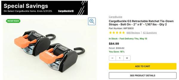 CargoBuckle Retractable Ratchet Tie-Down Straps - Bolt On - 2" x 6' - 1,167 lbs Note that one end is bolt on. Never used. Compare to etrailer.com price.