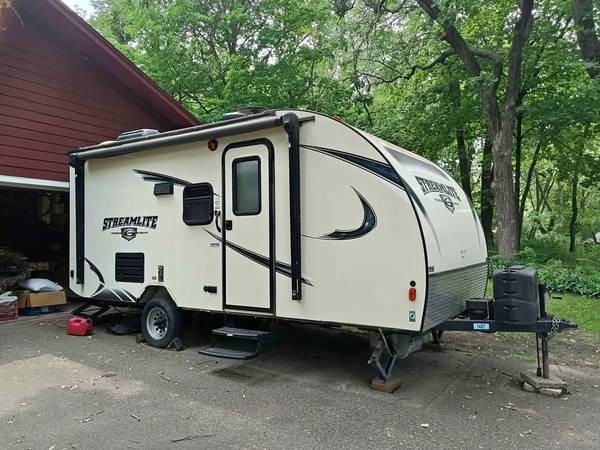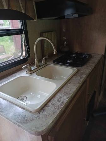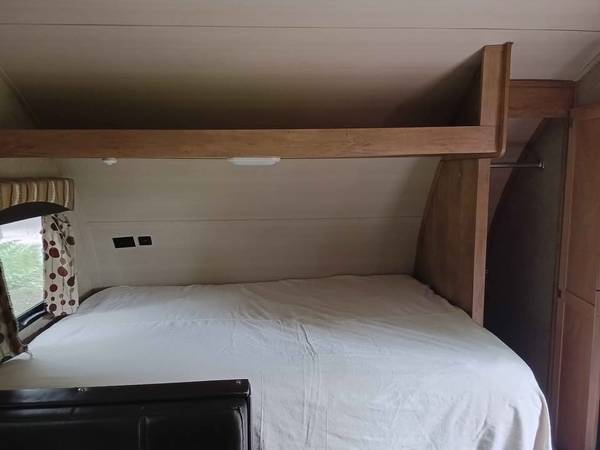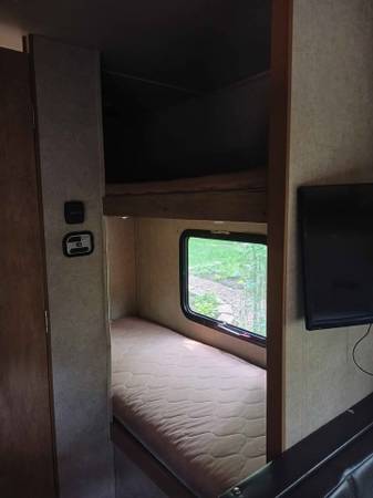 Clean and ready to go! Used on the road 2X. Only used AC and furnace. Solar compatible! Lit and powered retractable awning with speakers, sleeps 6(queen, mid-size refrigerator and freezer(spotless), 2 bunks, table turns into full), Bluetooth, microwave, TV, dual propane tanks, brand new freshwater hoses, 6 speaker surround, wheel chocks, built-in levelers, full bathroom with shower/small tub.