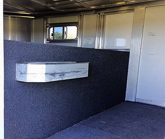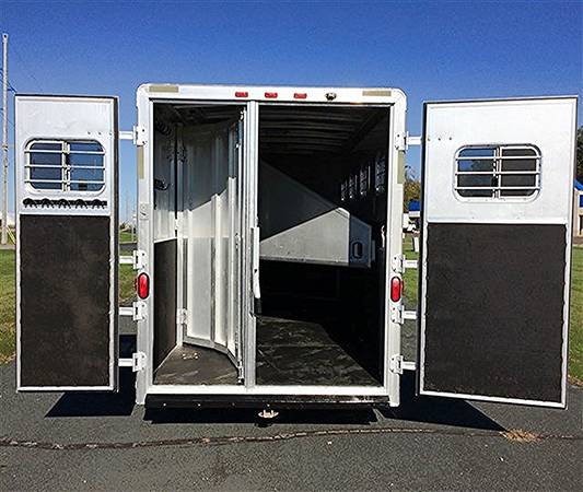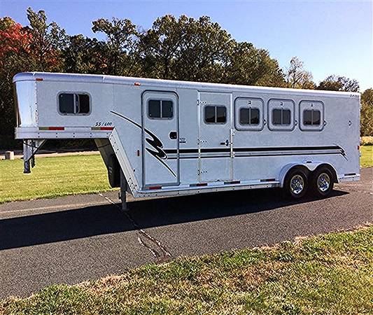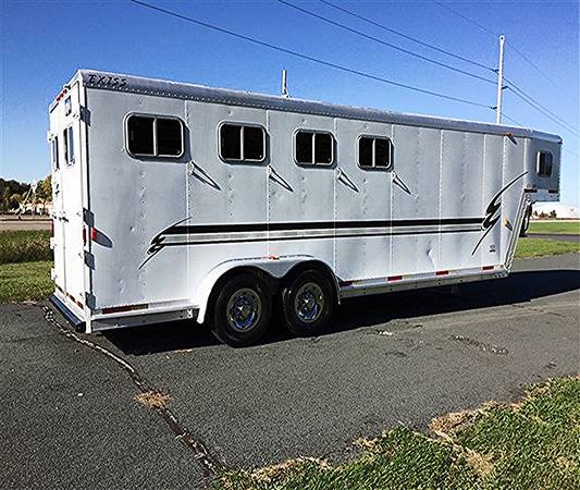 2000 Exiss SS400 4 horse slant load gooseneck trailer, 7′ wide, 7′ tall, and 21′6″ on the floor. Built with a stainless steel nose, 4′6″ short wall dressing room, and 4-tier saddle rack with blanket bar and bridle hooks. Equipped with escape door, drop-down feed doors with snap-in screens, sliding windows on the tail side, 2-way roof vents, fold-up rear tack with removable saddle rack, 7000 lb torsion axles, 16″ tires, and spare. Rubber mats on floor and walls