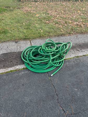 Kink resistant 5/8” thick green garden hose, suitable for outdoor use. Coupling came off and needs repair. Good hose if you know how to fix.