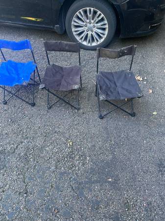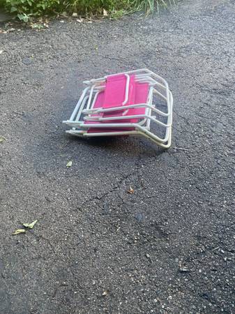 2 adult and two child pink chairs. Paint is scraped. 3 child folding chairs