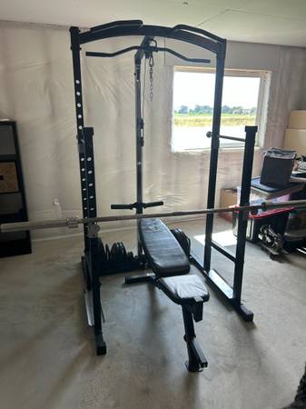 We moved and do not have space for this. It is disassembled but I have the directions to put it together. We no longer have weights or bar.