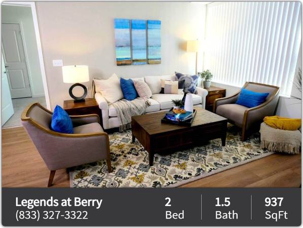 The Legends at Berry participates in an affordable housing program. IMPORTANT: One household member must at least be 62 years of age, and all other members at least 40 years of age. Household income & student status limitations apply. The household income is based on GROSS annual income (before any deductions) earned from all sources including; wages, social security payments, public assistance, pensions, annuities, interest income, dividends, stocks, bonds, insurance settlements, recurring gifts from family/friends, lottery winnings, etc. The property has a minimum household income requirement of 2 times the monthly rent amount to qualify. Third-party verification will be required of all income and copies of tax returns and pay stubs may be required.