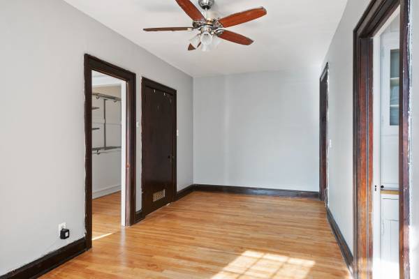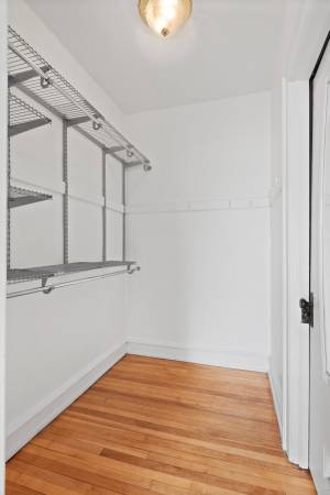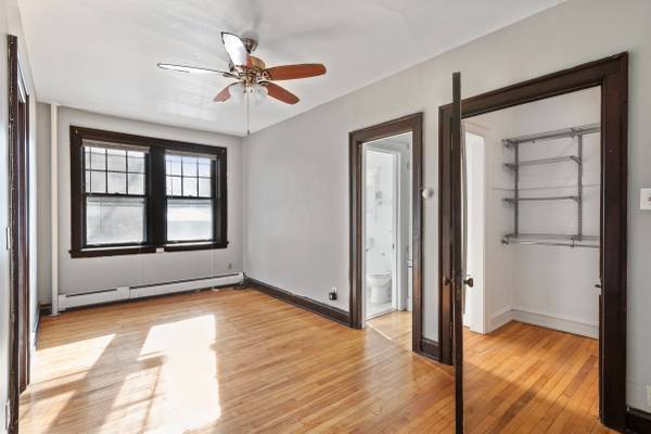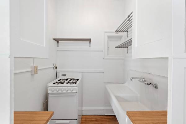 This spacious corner apartment offers a spacious, open living room and bedroom with french doors and plenty of closet space. Enjoy the historic charm of the original natural wood cabinets and farm style sink in the eat-in kitchen. The bathroom has a claw foot tub and access to the walk-in closet off the bedroom.