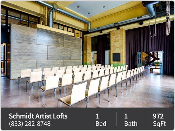 Schmidt Artist Lofts is truly a one of a kind apartment community! It was deliberately designed as a creative space meant to foster flourishing community artists on their journey to explore their craft. It merges history, affordability, quality, and individuality into each one of its carefully designed distinct loft-style floorplans. As an artist, Schmidt was made to support you and your medium! It includes a number of artist amenities like a dance studio, pottery studio, play/performance studio, mixed media studios, sound studios, paint studios, and a gallery.