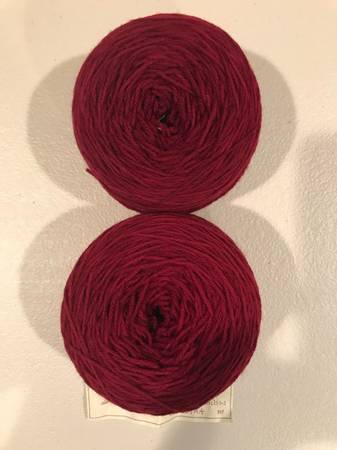 Fingering Weight 200% Merino Yarn. Gauge: 8sts = 1 inch using size 1-2 needle. 400 yards per skein, 2 skeins total 800 yards. Color is a dark cranberry. I paid $38.00 for both skeins, asking $30.00...