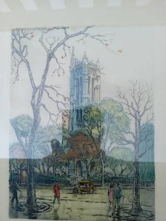 A charming ink on color of people in a square with a 1930's era car in the center and a tower with three statues on the top in the distance. I am guessing Paris since that was the place Marcel Julien Baron did so much of his work.