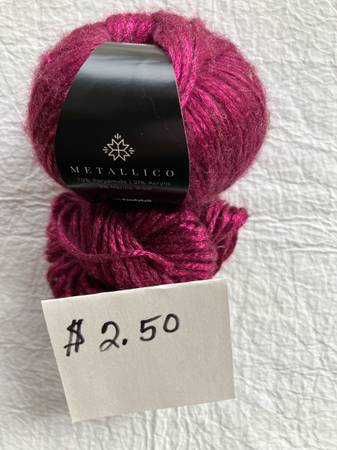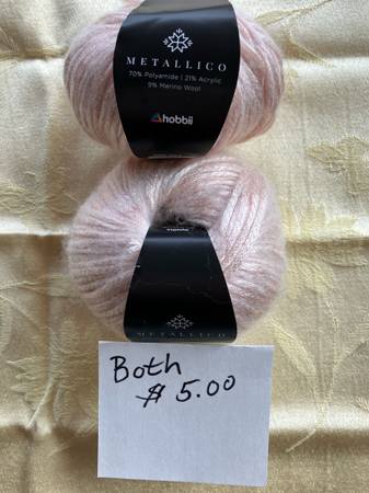 Colors 2 skeins white $5.00, 2 skeins pink $5.00, 2 skeins green $5.00, 2 skeins light blue with silver $5.00,