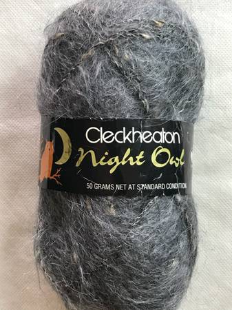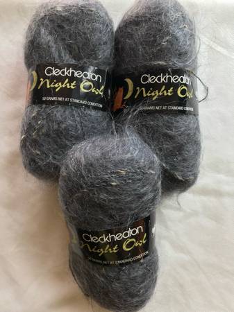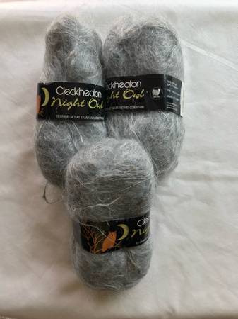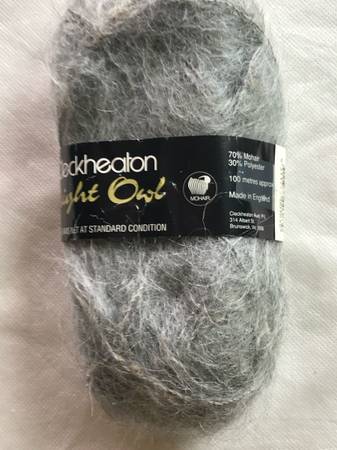 Cleckheaton Night Owl yarn. 70% mohair, 30% polyester. Bulky weight. 109 yards per skein. Color - 3 skeins of light gray for $12.00, and 3 skeins of black for $12.00. You can purchase either both colors or just one color.