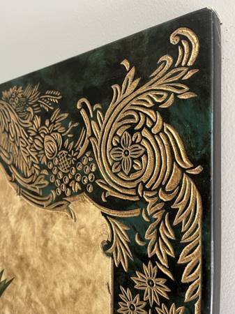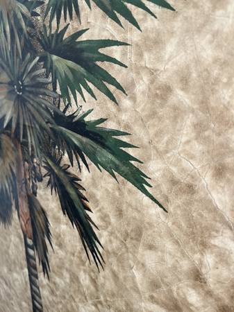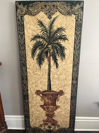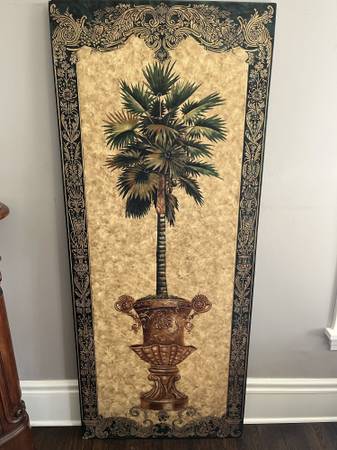 Palmetto Palm Decorative Panel Hangings, originally purchased from One Kings Lane. Three separate wood panels, measuring 6 feet tall by 30' wide - can be hung (there is hardware on each) or tilted against wall. Each panel has beautifully carved gilded edges, and the scenes look like they were painted on cracked leather or parchment - the patina effect is lovely. Three panels available - two of the regular palmettos and one of the tree with red fruit.