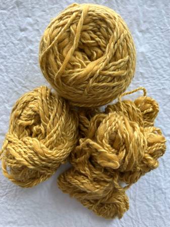Tahki Tucson Yarn. 52% cotton and 48% wool, made in Italy. Gauge 17 sts and 23 rows = 4 in using size 9 needle. 108 yards per skein, 5+ skeins. Color is kind of a marbled yellow and gold. Asking...
