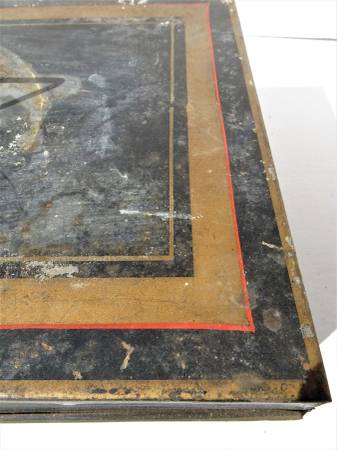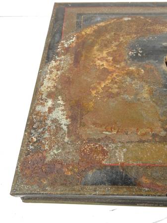 Original distressed patina and rust on exterior, plus a ring of rust on one side.