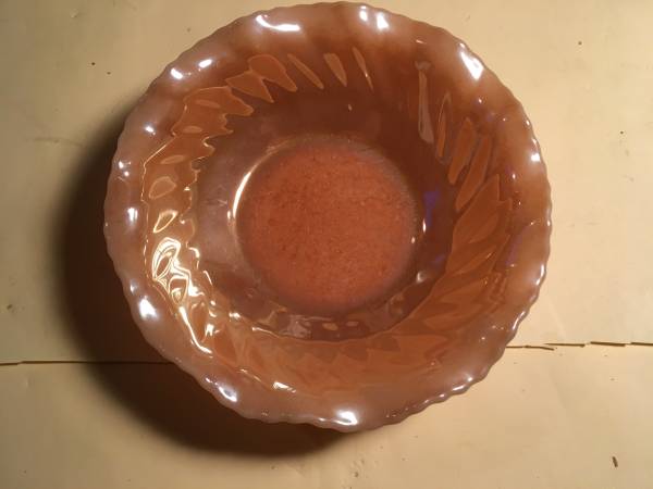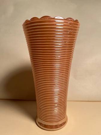 FireKing Peach Lusterware Vase by Anchor Hocking from the 1960s Width 4 inches, Height 7 inches. This vase is made of white milk glass with a scalloped edge and peach lusterware finish. $25