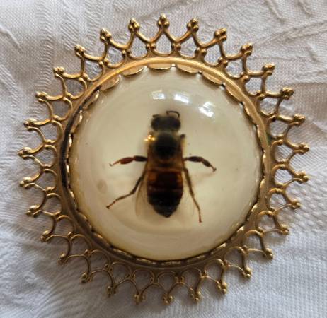 Bee encased in dome (polymer or glass?) With metal backing and metal sunburst surround. Likely brass. Pin/brooch. Approx 2 inch across.