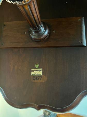 Constructed from genuine mahogany, as certified by the Mahogany Association, Inc. label. There are some marks on the top as seen in the pictures but in very fine condition for it age!