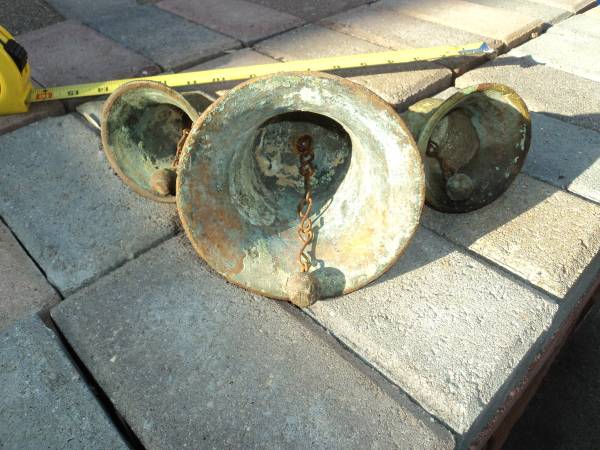 Center bell is 4 11/16" diam. and side bells are 3 1/8" diam. Clappers are present. One side clapper is not connected (but present) due to rusted off connecting link--easily replaceable.