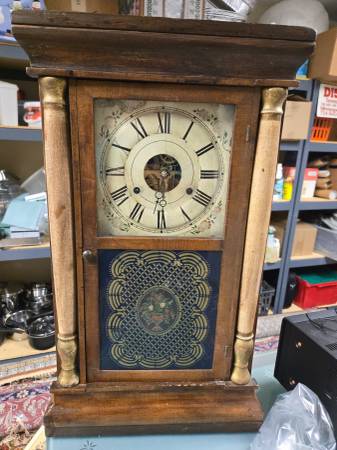 This clock is in good antique condition, with original glass, wood finish, and mechanism. Some of the gilt has worn off over years of time, from the side columns. It is currently non-working, chimes work, and easy restore for the right individual. Even still, this is an extraordinary clock from the 1800's! String pulls and weights, seem to be in order, and all parts are there, including keys.