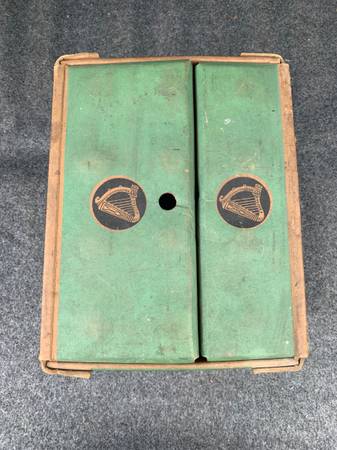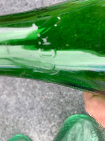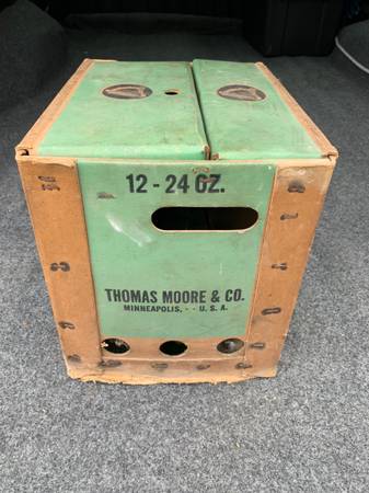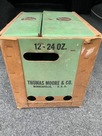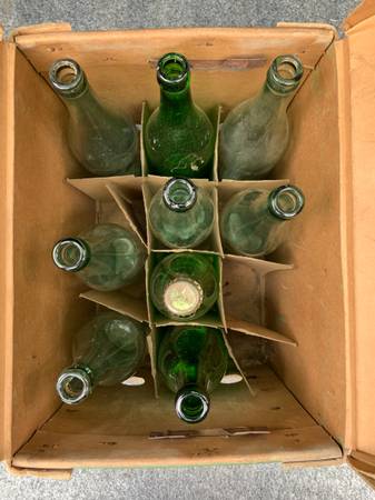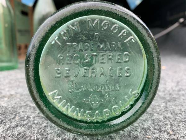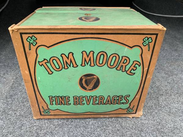 Tom Moore beverage carton with nine antique bottles. Six Tom Moore bottles and three unknown bottles.