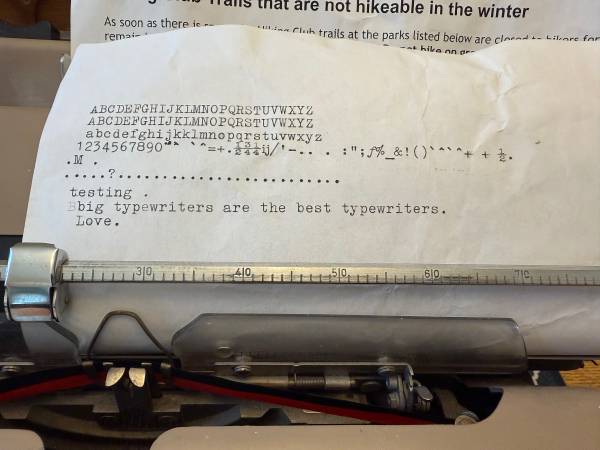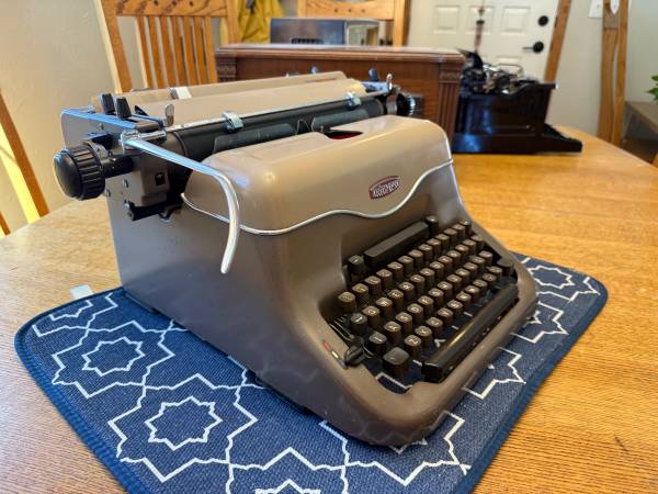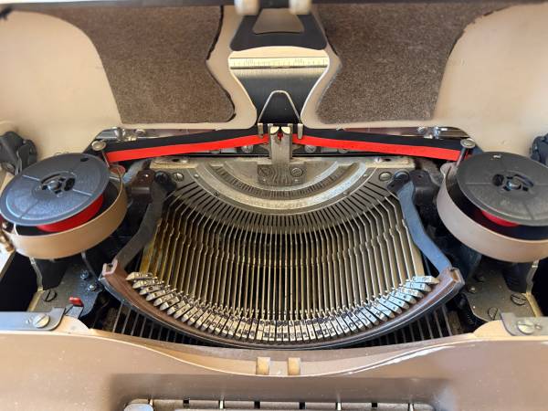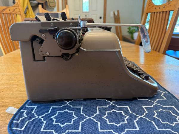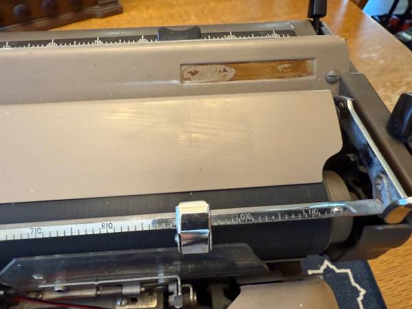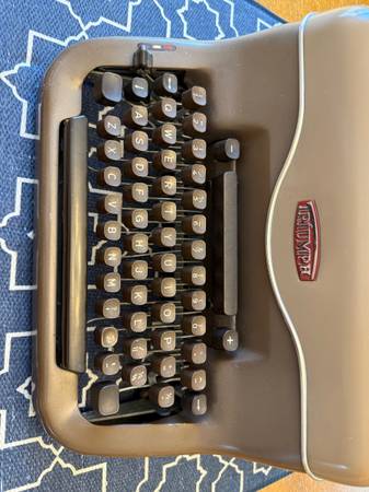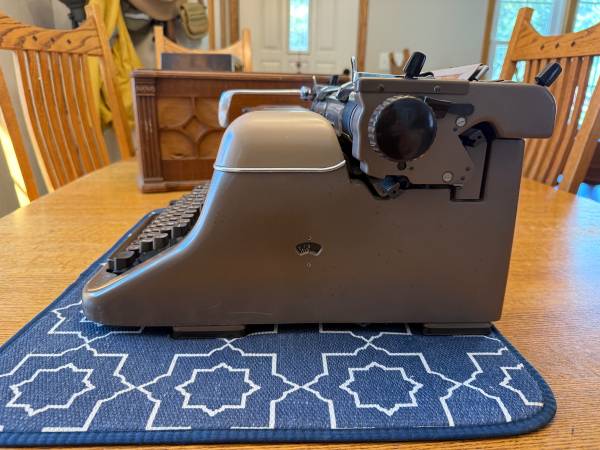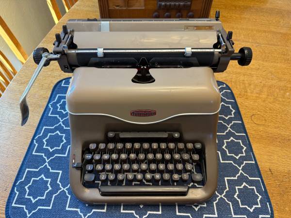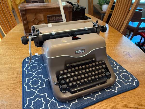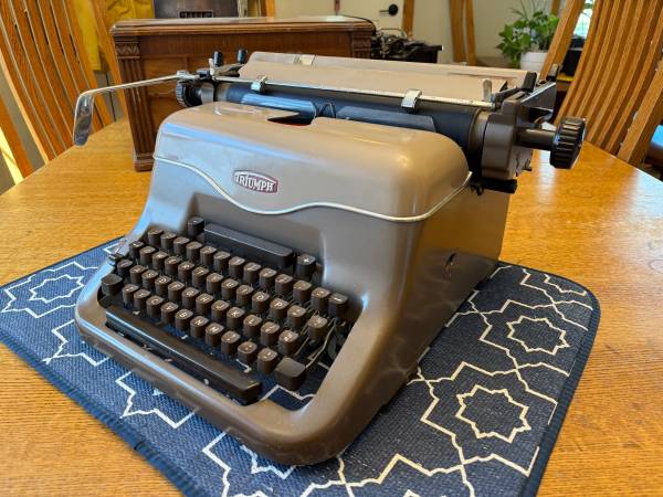 It’s got a new ribbon, but you’re going to notice the white specks all over which is the life it had. Sometimes people use correction fluid in a hurry and then they don’t wipe up the machine and then it becomes part of its’ identity. Regardless, the Triumph Matura is a robust, beautiful typewriter that has a lot to give. Pick up and cash only, Saint Paul, MN.