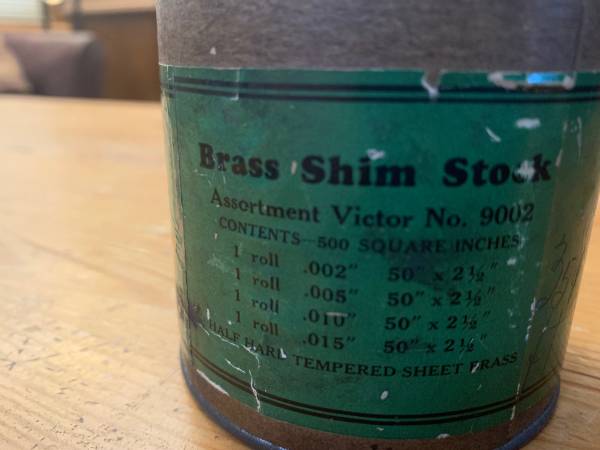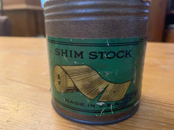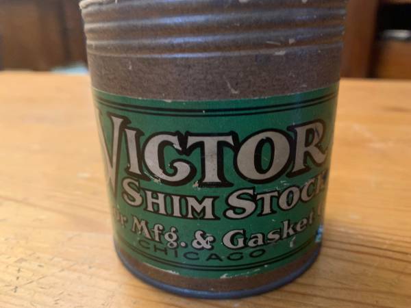 Canister that holds Shim Stock. Made by Victor Mfg & Gasket Co. Contains 26 inches of shim stock. I am led to believe it is from the 1910s to 1930s. In excellent condition, including the label. The only negative is that it is missing the lid.