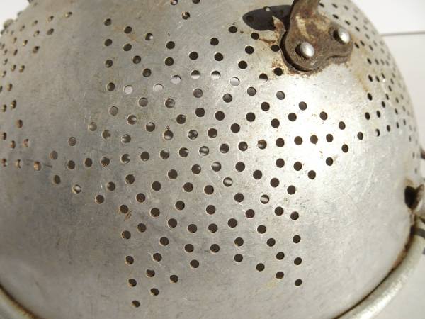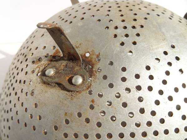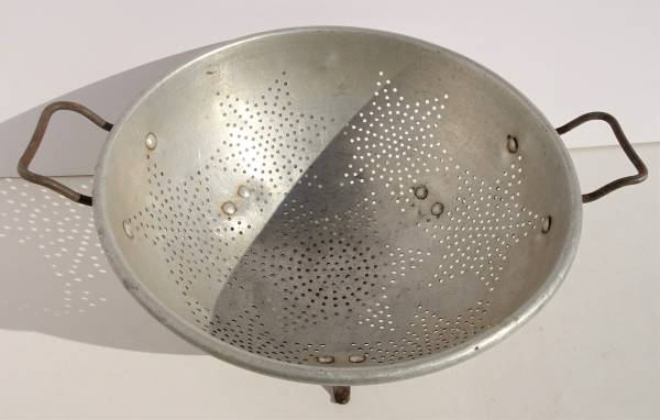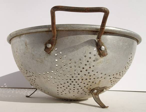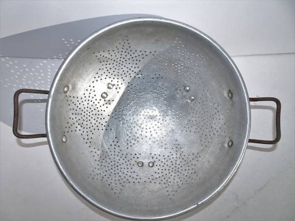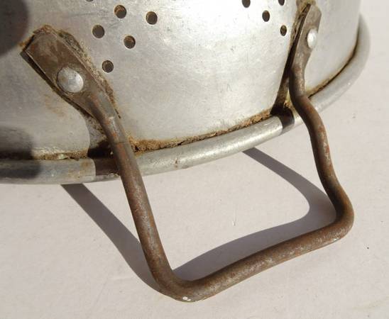 Vintage well used original Mirro solid aluminum colander strainer with riveted handles and three feet. Each foot shows some wear and aging around it. Slight denting and wear making it look even better and authentic.
