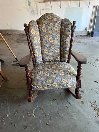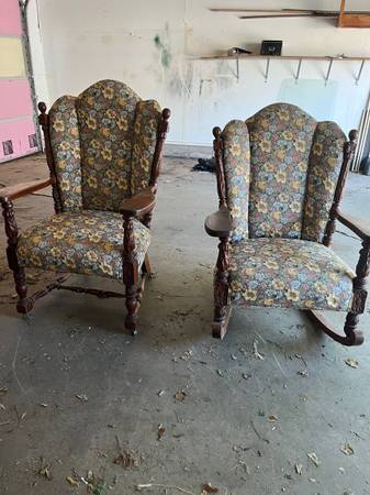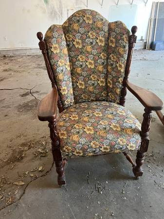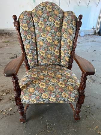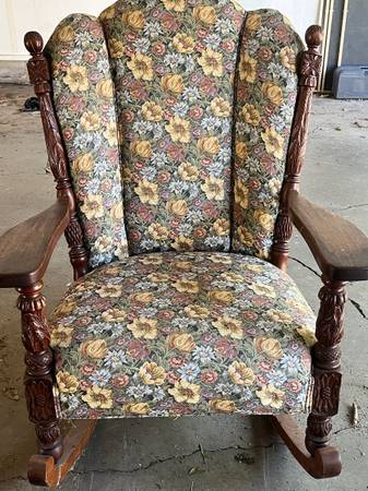 Pair of hand carved vintage armchairs with floral upholstery and wooden armrests. One is a rocking chair, one is not.