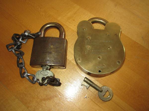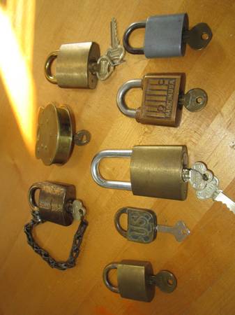 This lot of 8 vintage padlocks features locks labeled Fraim, Standard Oil, U.S., Corbin, Russwin and Slaymaker. All work and include one or more keys! Questions? Please ask. Transaction will occur at the Maplewood Fire/Police station at 600 McKnight Road North, 55119.