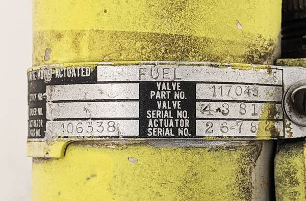 For sale is this aircraft Fuel Valve assembly that is Motor Actuated. The actuator p/n is 106338, the valve p/n is 117045. It is 18-30 Volts D.C. and is 5.0 Amps MAX at 26 Volts. It shows some wear and is Used and As-Removed, but overall in good condition.