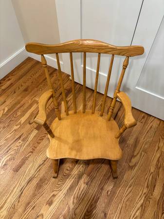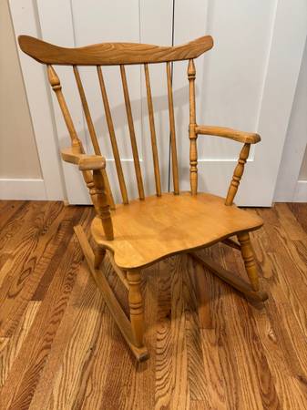 Solid maple wooden child’s rocking chair. Quality construction with solid glue joints. Natural finish.