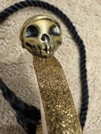 We no longer have the costume, but we had replaced it with a sword. This is a whip with a sword handle that has a pirate skeleton head on the top. Made of plastic and the rope is probably nylon....
