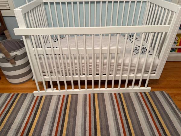 Room and board crib up for sale. the top is white with solid walnut feet. comes with toddler bed conversion rail as seen in the picture. will also include sealy toddler mattress w/ a whiteproof mattress cover. The mattress is accident free (we're lucky). the sheet in the picture is not included (we have a Nanit setup if you're interested). there's some minor chips that are only noticeable up close but otherwise in excellent condition.