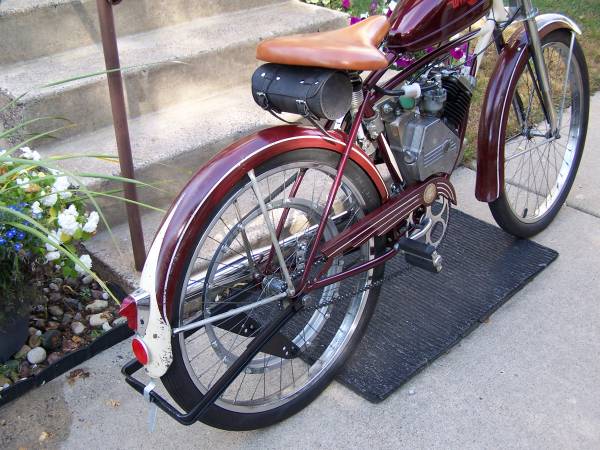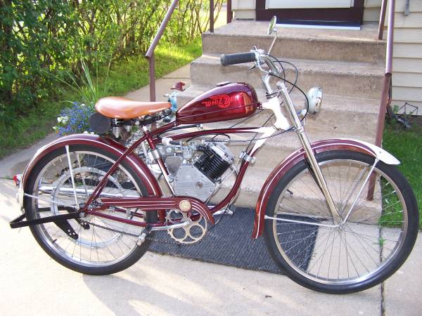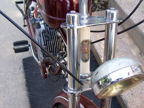 Schwinn Whizzer, it has a rebuilt H series motor. All moving parts on the bike were cleaned and re-lubed, drive belts are new. Tail lite and head lite are in working order.It also has a very rare front fork. Starts easy and runs very nice. Call for more info. Thanks