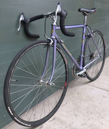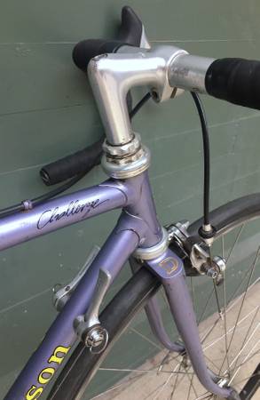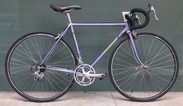Circa 1984 Bill Davidson "Challenge" Road Bike, handmade in Washington State, USA. 49cm c-c seat tube, 50.5cm c-t seat tube, 52cm c-c top tube, 30" stand-over height. Best for riders 5'2"-5'6". Tange Prestige double-butted chromoly tubing throughout. Lilac paint is nice but shows some signs of use. Full Shimano 6x2 600EX group with indexing/friction shifting option. 165mm crank arms (42/52t), 13-25t 6 speed freewheel, Cinelli bar/stem (36cm c-c/70mm c-c), 700c wheels with Mavic MA-40 rims, newer Specialized "Pro" tires. Bike has been fully tuned up and is ready to enjoy. A stable, but agile ride on this bike. Nicely set-up all around for a smaller rider. Great for tooling around the city or a long day in the saddle. Feel free to ask any questions. Thanks for looking. Cash only.