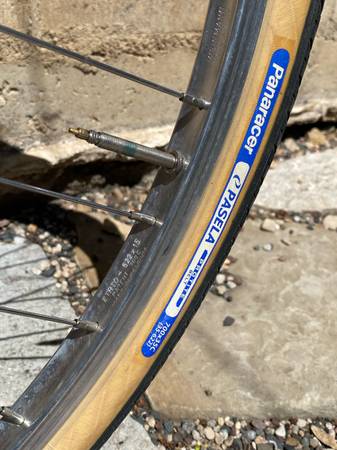 700x35c tires sitting on alloy rims. Maillard hubs. Wheelset is a fresh handbuilt set with stainless steel spokes. New panaracer 700x35 touring tires look good on this and are like-new condition.