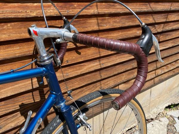 Leather bar tape, Ideale made in France leather saddle. New cables and housing, Sachs Hurret Rival rear derailleur has powerful springs and is super clean. Atom french made alloy pedals with leather covered toe clips, a Sedis chain, and 6 speed, early 80's vintage Shimano made freewheel round out the components.