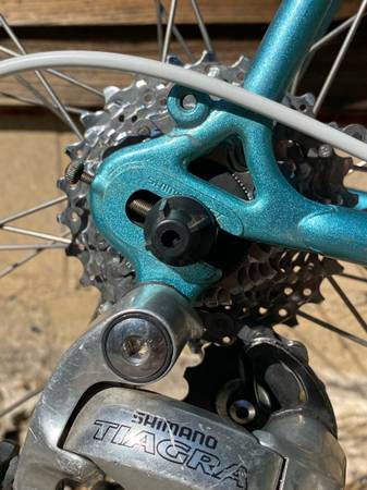 The whole bike really comes together when you factor in the wheelset, classic looking, but modern, Mavic double wall 700c rims on Shimano 105 hubs. Beautiful condition, roll super smooth, with no dents or dings. 9 speed component mix of Shimano Tiagra and 105. Salsa Pro-Moto bars are pretty wide, and have a good ergo & flare to them. Frameset accommodates the 700x32 Specialized all condition tires easily, you could maybe fit more. Tires are used, but in decent shape with plenty of tread left and no cuts, they're pretty durable overall.