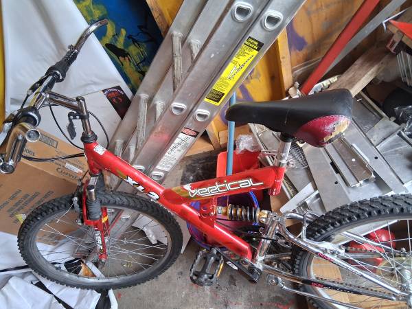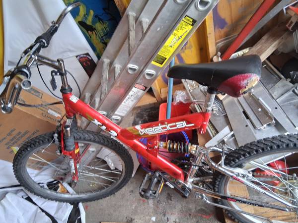 This is a Vertical brand mountain bike, youth/teen size (l24-inch wheels). It has: Excellent Front suspension Rear shock (full-suspension) Basic steel frame V-brakes Worn seat Some cosmetic wear