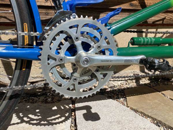 Frame is hand brazed by the Minneapolis legend, Terry Osell. If you're unfamiliar with his work, he worked as a prominent local frame builder out of Northeast Minneapolis area back in the 70's & 80's. He produced custom made to order, high end road bikes, touring bikes, recumbents, and tandems. His workmanship typically includes use of high end frame tubing, tidy lug work, and classic Imron paint. If you ever met Terry in person, he was a real character. He worked at the same time other local legends in frame build like Kvale, Croll, and Goodrich all were also making high end custom bikes in the Twin Cities.